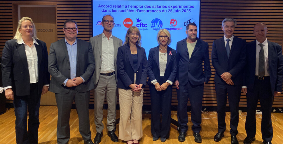 Cet accord, signé par France Assureurs et cinq organisations syndicales (CFDT, CFE-CGC, CFTC, FO et UNSA), inédit au niveau d’une branche professionnelle, a été présenté le 1er octobre lors d’un événement organisé par France Assureurs. Sur la photo de gauche à droite : Virginie Le Pape (CFTC SN2A), Francky Vincent (CFE-CGC), Jean-François Besnard (CFDT), Christelle Bouron (France Assureurs), Florence Lustman (France Assureurs), Franck Daloz (Unsa), Alexis Meyer (France Assureurs), Laurent Tissot (France Assureurs).